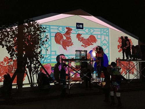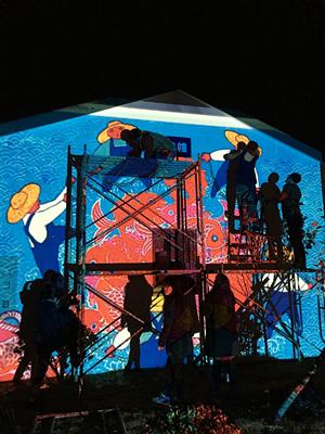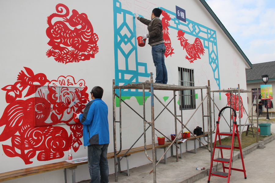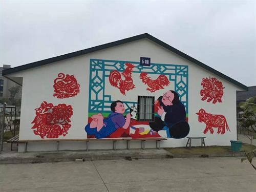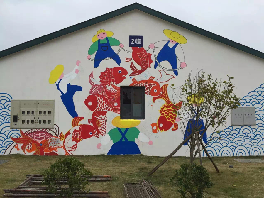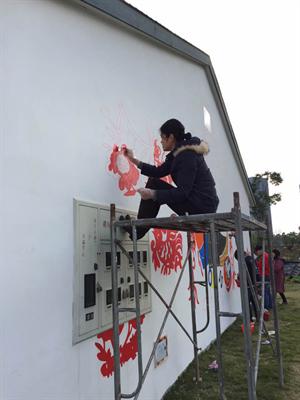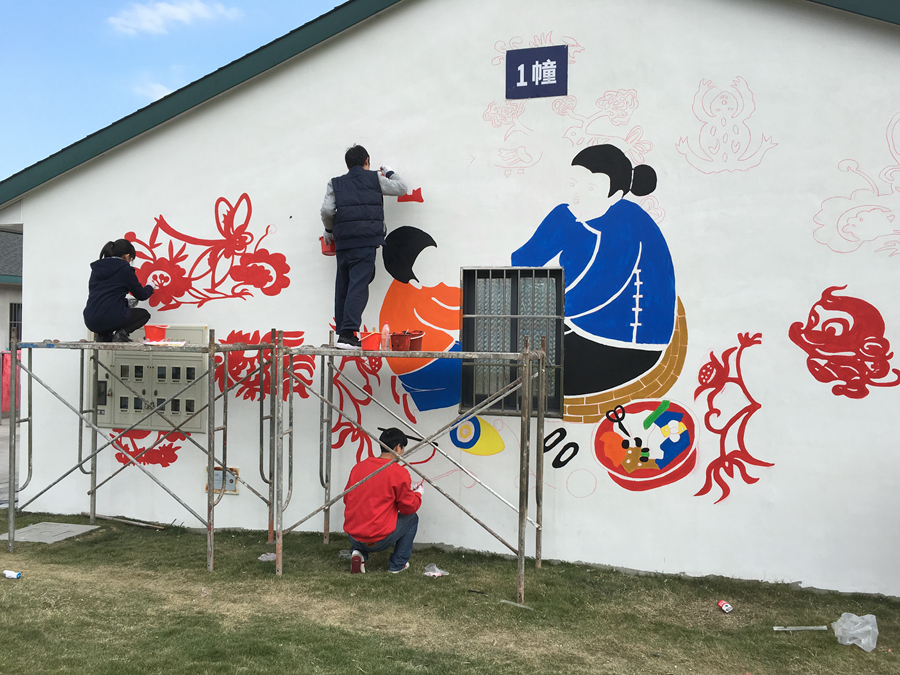 壁画以舟山渔民和老年文化元素为主题。绘制渔民画的过程中,学生们直接用粉笔在墙上勾勒出草图;而剪纸图案壁画花纹繁琐直接勾勒难度较大,遂启用投影仪将电子画稿投影到墙面上再勾勒出草图。由于投影仪的特殊性必须在夜晚工作,大家顶着严寒在昏黄的灯光下细心描绘直至深夜,终于勾勒完所有草图。第二天早晨赶在太阳升起时又立即开工准备上色,由于墙面面积大,同学们在2米高的铁架上长时间保持同一姿势且双手没有任何支撑物的情况下作画,也丝毫没有懈怠。居住点的大伯大妈看着一面面素墙瞬时变得丰富多彩起来,连声夸赞道:“晒太阳时看着这些漂亮的画,心情也变得好起来!”舟山当地新闻媒体闻讯后也赶来现场进行了采访报道。