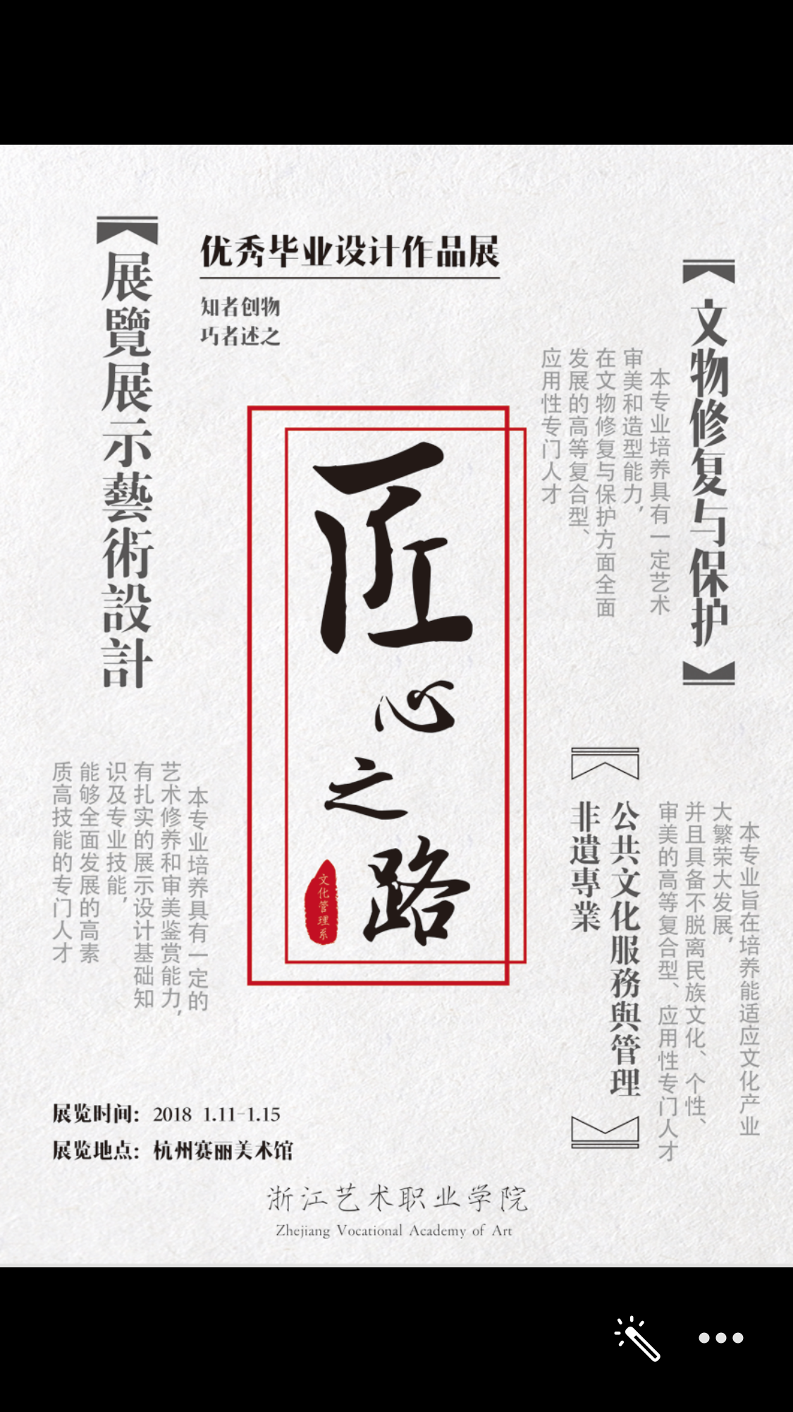 展厅设在浙江赛丽美术馆4至6层。美术系展览楼层在4、5两层,4层主要展出动画设计、服装与服饰设计专业的作品,有二维动画短片、三维动画短片、视频装置、媒介传播、漫画、插画、舞台服装设计、创意时装设计等作品;5层展出广告设计与制作、环境艺术设计专业作品,包括家居家具设计、家居空间设计、软装装饰设计、商业空间设计、品牌形象推广设计、电商视觉营销设计等。文化管理系展览楼层设在6层,主要展出传统手工艺制作、博物馆插画、生态景观设计缸、陶艺制作、文物修复工艺等各类展品。文物修复技艺被誉为“妙手回春”术,破损的器物通过精心修复,赋予其新的生命。本次展览同学们展示了古陶瓷修复作品 ,以大漆修复和金缮技艺为主。