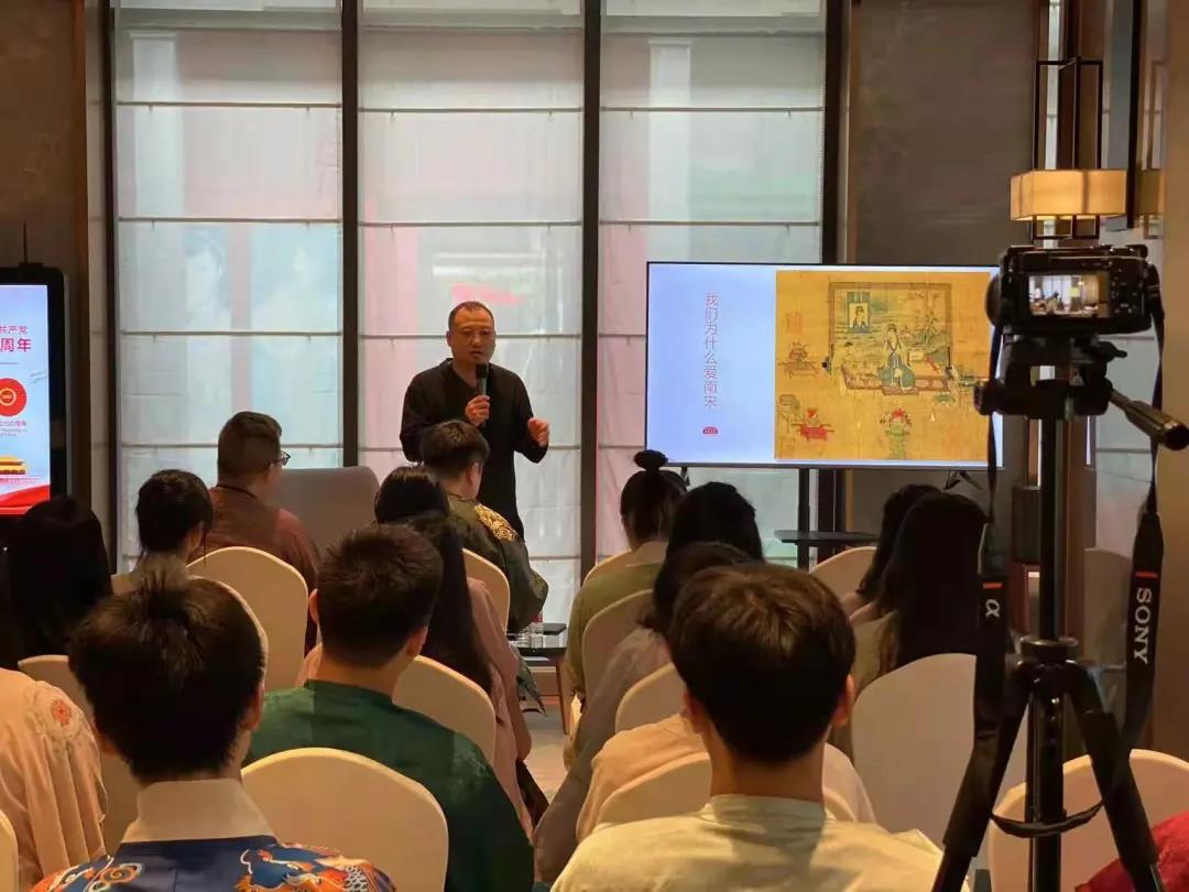 以史为镜,可以知兴替。想要体验宋韵文化,就需要先了解宋代历史。一场穿越千年的约会,从湖滨仁和饭店杭州书房开始,音乐系团总支特邀南宋文化学者李飞为音乐系师生开展《秋韵流芳一一南宋王朝的盛世危情》讲座。通过讲座,李飞向师生们讲述一个文化艺术伟大辉煌,真实而又客观的南宋王朝。宋太宗、宋徽宗、岳飞等等历史书上的人物,一个个都鲜活了起来,讲座现场,师生们身着汉服,认真听讲,仿佛置身宋代时空。