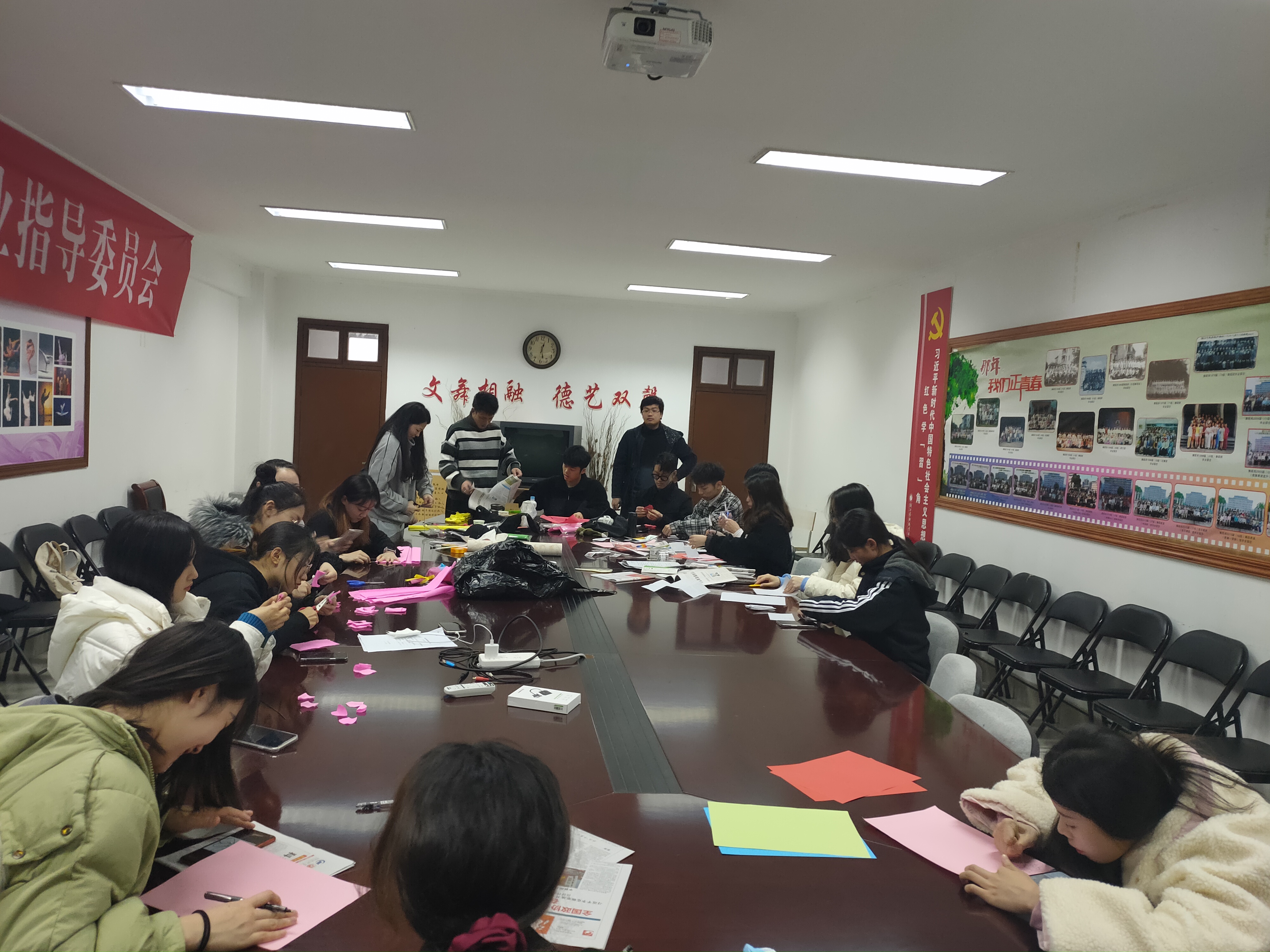 舞蹈系团委学生会的同学们别出心裁,利用周末时间亲手编织爱的花朵,在节日当天给老师们一个惊喜。同学们在前一天准备好了手工制作材料,分工明确,男生女生一起,有的剪“花枝”,有的剪“花瓣”,有的把“花瓣”们粘成“花朵”,有的把做好的“花”包装好。心灵手巧的他们从零学起,仅用一整天的时间就做出了300朵手工花。