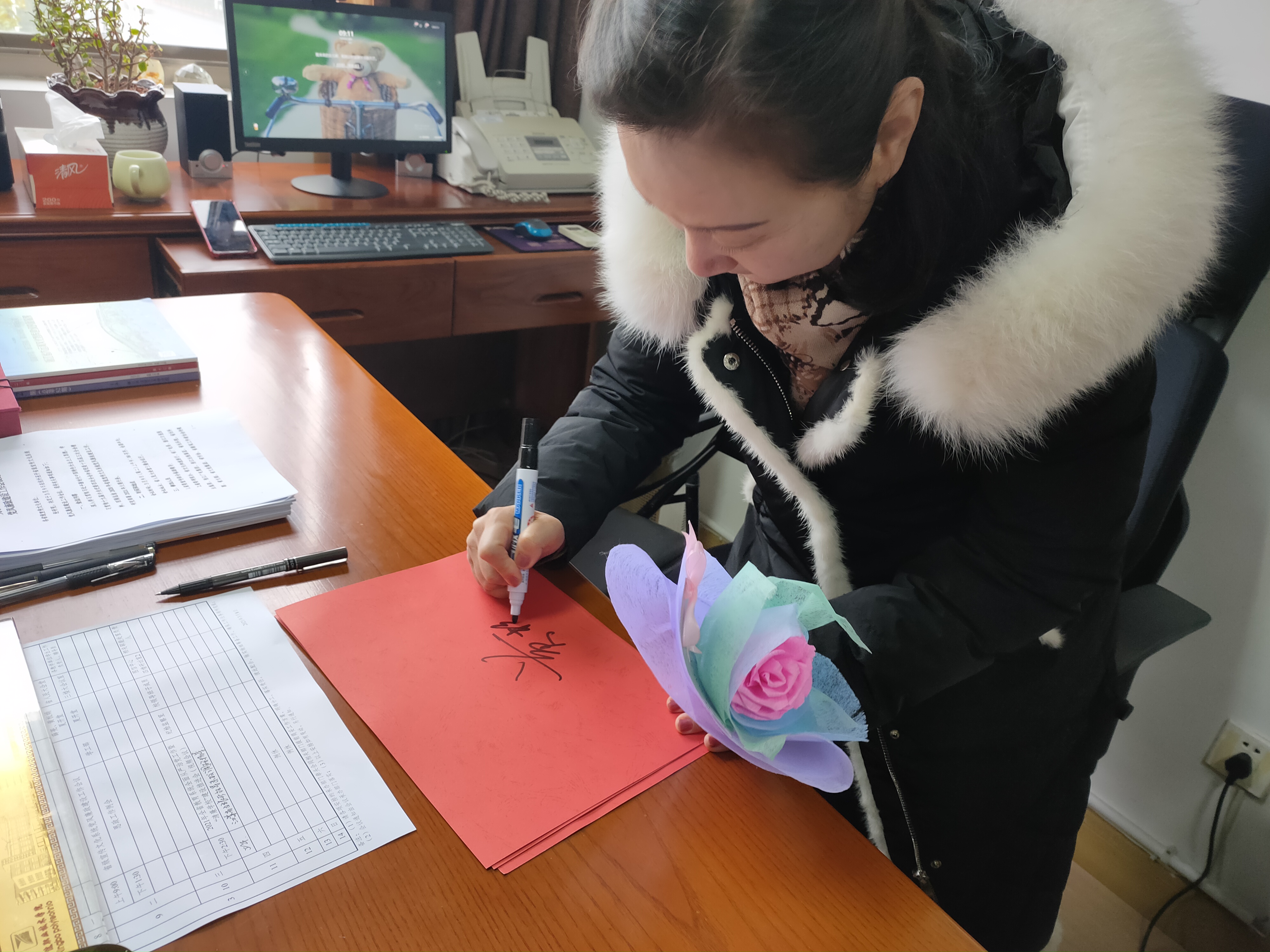 38日清晨,同学们将一朵朵五颜六色的花束献给平日里辛勤浇灌艺术之花的老师们,这是一种爱的回馈。老师们接过“鲜花”,露出开心的笑容,她们在签名簿上签字,留下了温暖的印记。