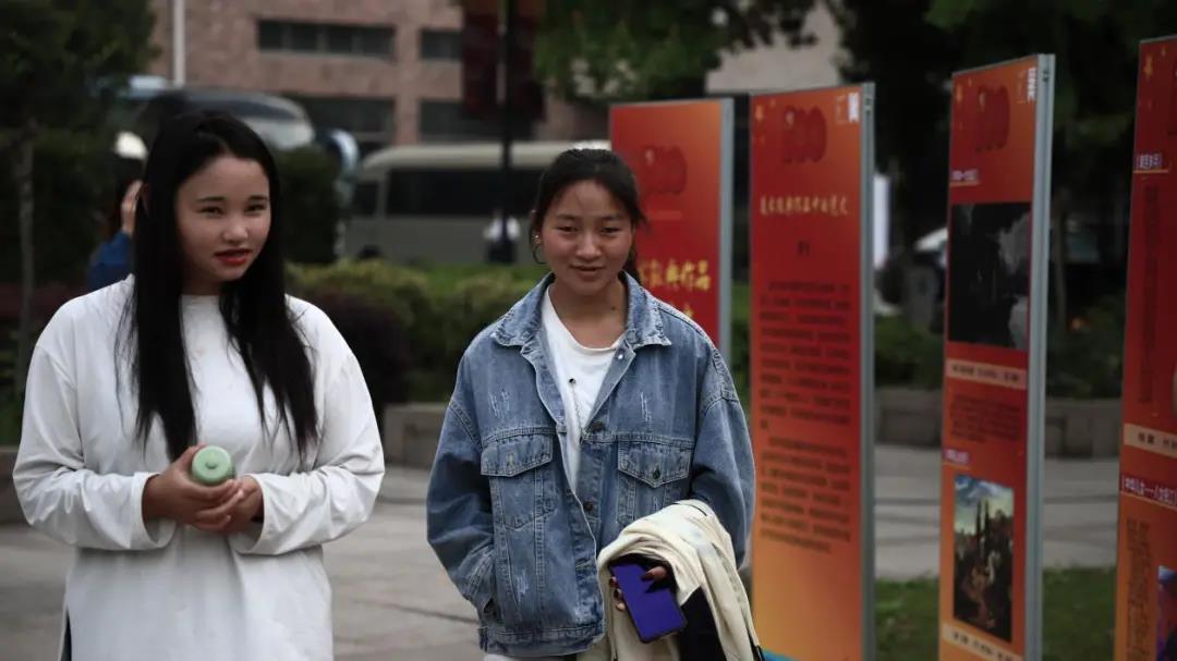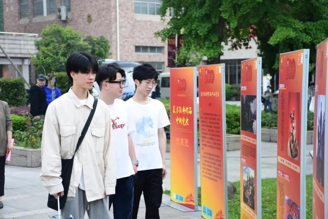 升旗仪式结束后,同学们观摩“美术经典作品中的党史”微展览。