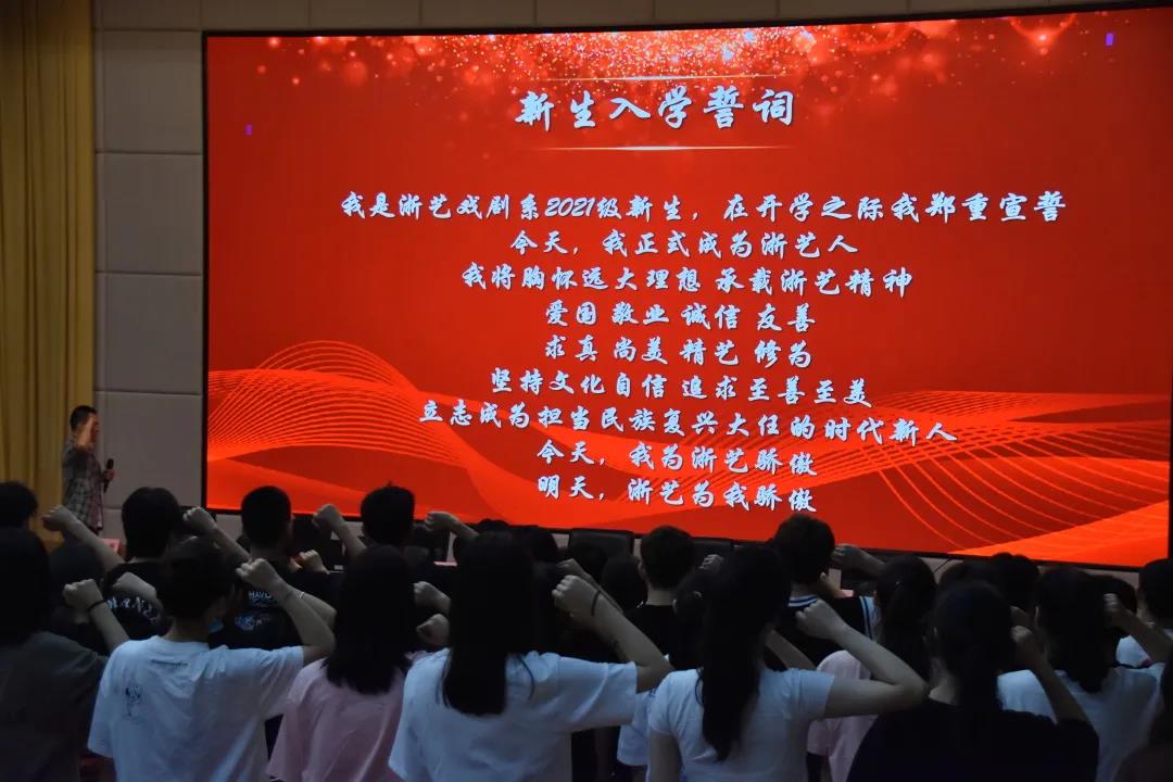 老师们为新生代表佩戴校徽,全体新生进行“我是浙艺人”宣誓。