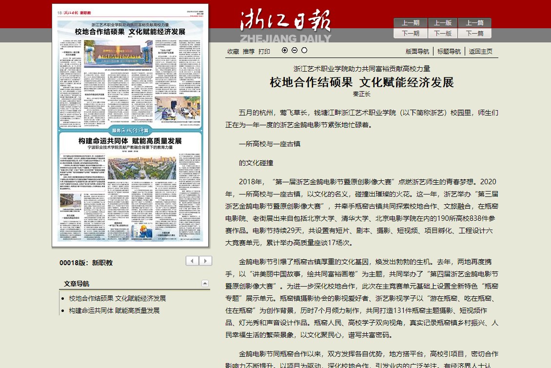 当下,在国家推进文化强国建设,文化和旅游融合、职业教育改革发展、教育国际化的宏大语境中,浙艺主动把握机遇,迎接挑战,创新发展,在“文化+引领”为区域产业发展增添新动能的道路上,越走越远。