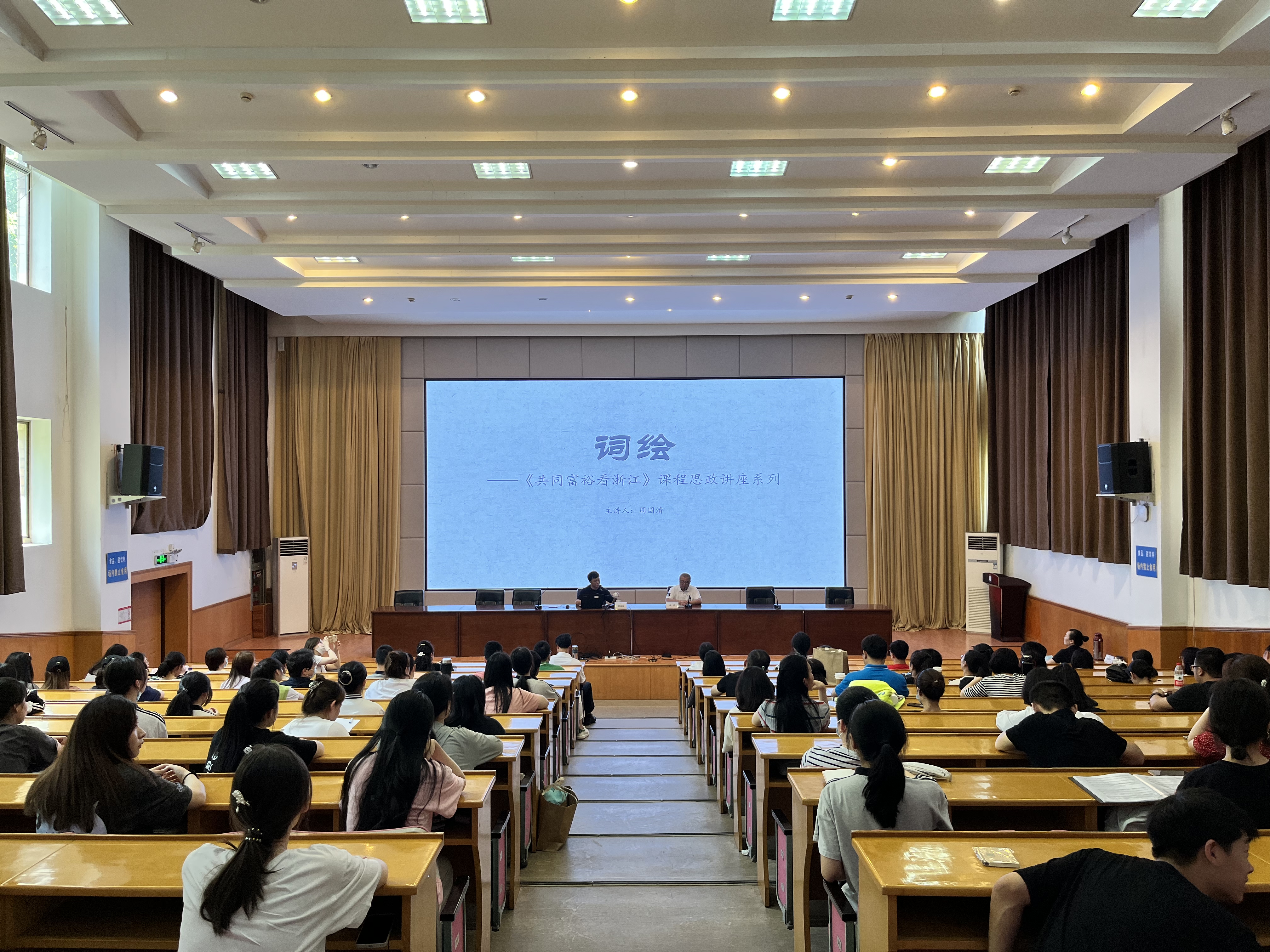 6月6日,2021年度浙江文化艺术发展基金资助项目大型原创音乐作品《共同富裕看浙江》活动讲座之《“词绘”——共同富裕看浙江》在校图信报告厅举行。本次讲座邀请诗词作者、编剧周国清担任主讲嘉宾。讲座由音乐学院副院长潘骅主持,音乐学院领导班子、全体教师、学生代表现场观摩聆听了讲座。
