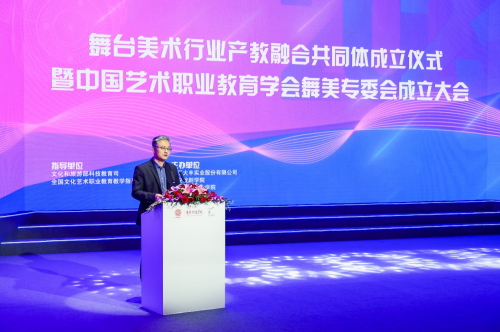 文化和旅游部科技教育司司长陶诚在致辞中指出,行业产教融合共同体是新时代我国职业教育体系改革的重要载体之一,在深化职业教育改革中发挥着重要作用。在舞美行业产教融合共同体下一步工作中,从统一目标、加强联动、开放创新三方面提出意见。需做好共同体的建设发展,秉持开放创新的精神,强化集体协作和联合攻关,坚持优势互补、互惠互利,构建新型科研组织模式和创新成果转化模式。不断推进舞美领域科技研发、技术创新和产业转化,为文化艺术职业教育服务行业发展积累新经验,提供新动能。