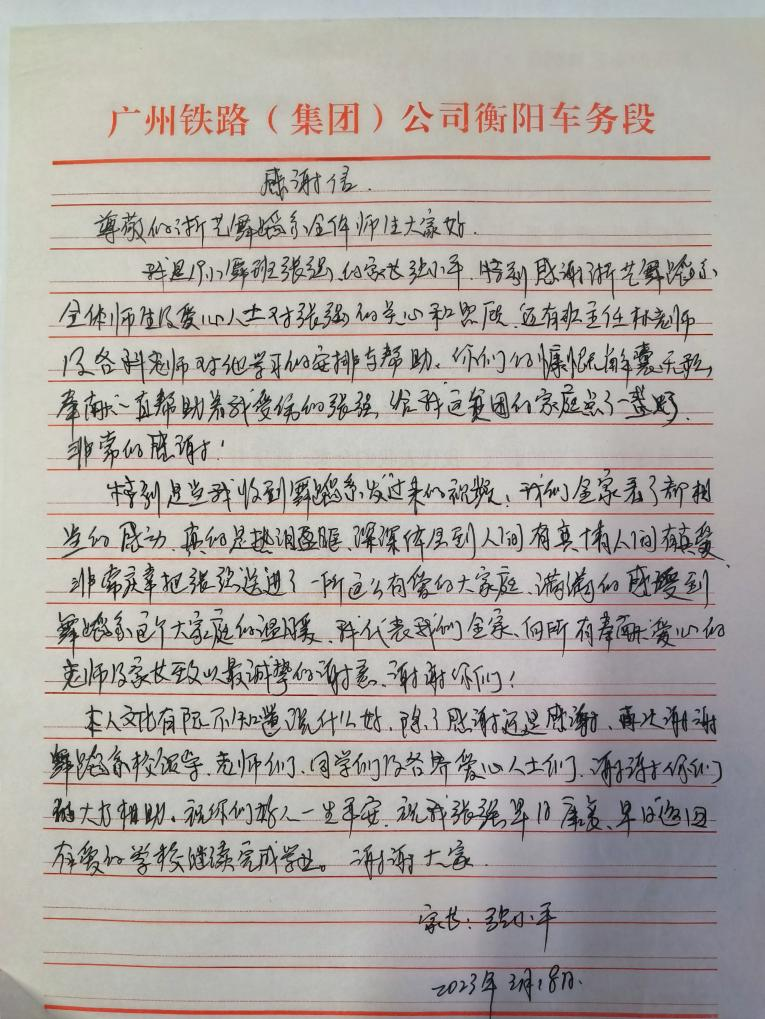 2019级舞蹈表演(中国舞)班的张强同学的伤情,一直牵动着每一位老师和同学的心,在收到舞蹈学院组织募集的7万余元善款后,张强的父亲用一封感谢信表达了全家对学校的感谢之情。