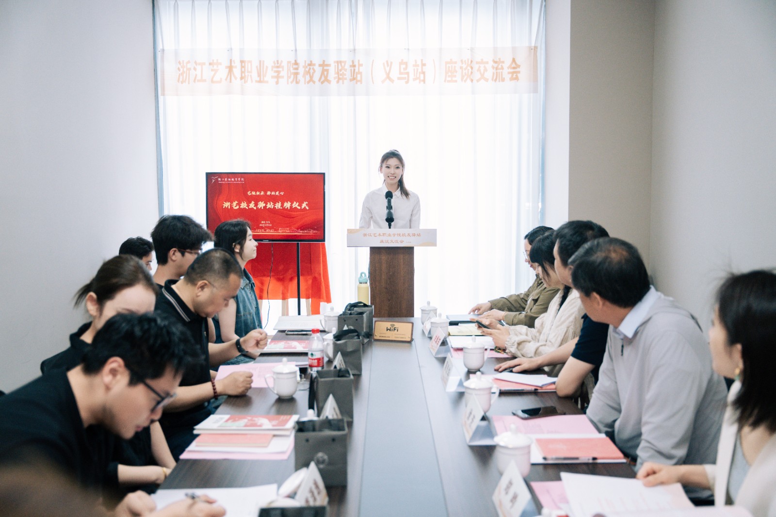 挂牌仪式上,徐芳代表学校向校友们转达母校的亲切问候,强调校友驿站战略定位为“双向赋能平台”,它不仅是校友情感联络的温馨港湾,更是艺术创新的实践起点、浙艺人在义乌的“艺术创业之家”。校友驿站将成为校地协同发展的艺术枢纽,通过资源共享、创新赋能,持续助力校友事业发展,让‘求真 尚美 精艺 修为’的浙艺精神在义乌落地生根、薪火相传。